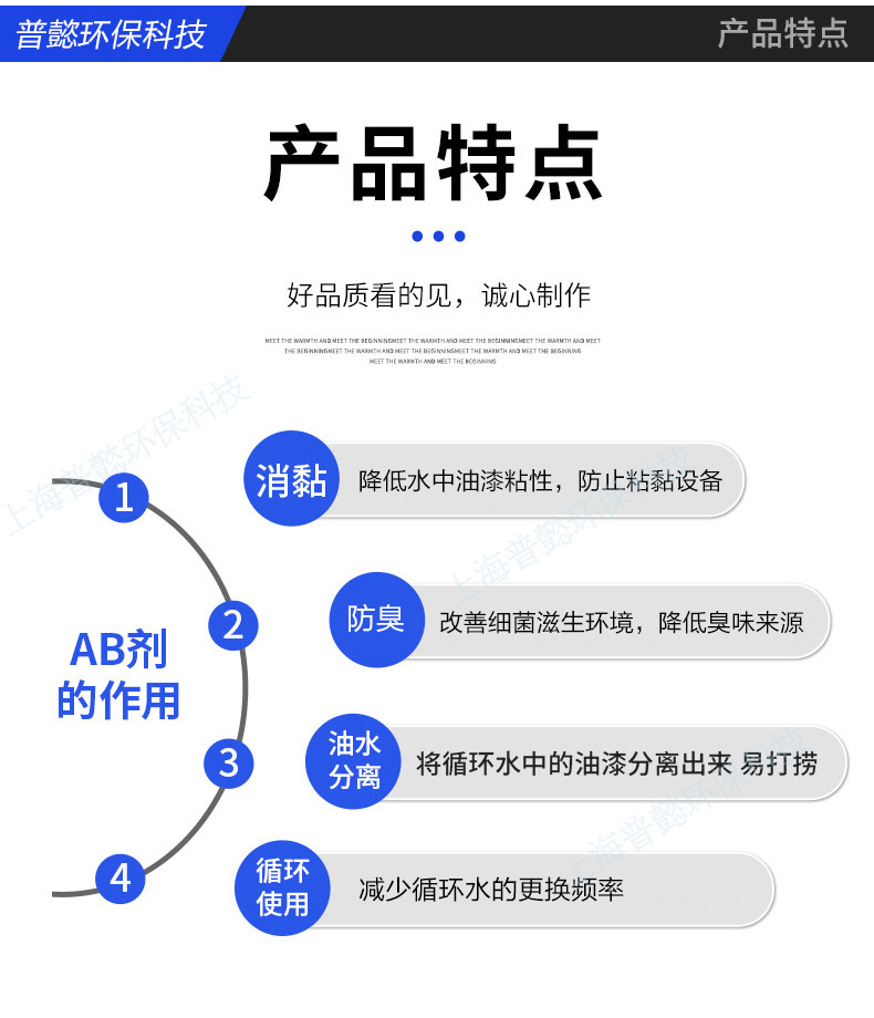 漆霧凝聚劑A劑具有消黏、分解作用,主要起到對噴漆廢水中的樹脂、有機物或懸浮粒子進行吸附、分解、電荷中和等作用,破壞膠體或粒子的穩定性,產生漆水分離的效果。漆霧凝聚劑B劑為凝聚、懸浮的作用,能夠對已經被A劑分解的油漆渣和漆渣之間連接起來,較為快速的凝聚懸浮在循環水的表面上,將漆渣顆粒進行凝聚成大塊,形成較大的漆渣絮狀物質并且上浮,產生固液分離的效果,保持循環水干凈,從而延長循環水的使用周期。